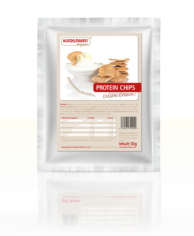 | Protein Chips Onion Creme | 1660 kj/ 498 kj | 397 kcal/ 119.1 kcal | 13.1g / 3.9g | 1.1g / 0.3g | 15.6g / 4.7g | 3.9g / 1.2g | 17.9g / 5.4g | 45g / 13.5g | 4.1g / 1.2g |