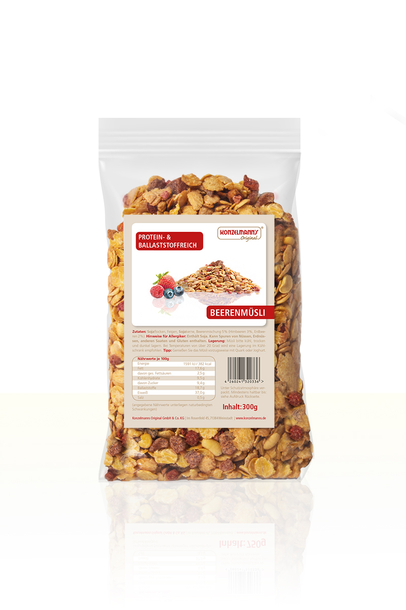 Mit viel Protein bei 30 % weniger Kohlenhydraten als herkömmliche Beeren-Müslis sorgt es für den perfekten Start in den Alltag. Dabei ist unser Beeren-Müsli frei von Zuckerzusätzen und besteht aus rein natürlichen Zutaten. Neben Sojaflocken, Feigen und Sojakernen enthält unser Müsli eine Beerenmischung, die aus getrockneten Himbeeren und Erdbeeren besteht.
