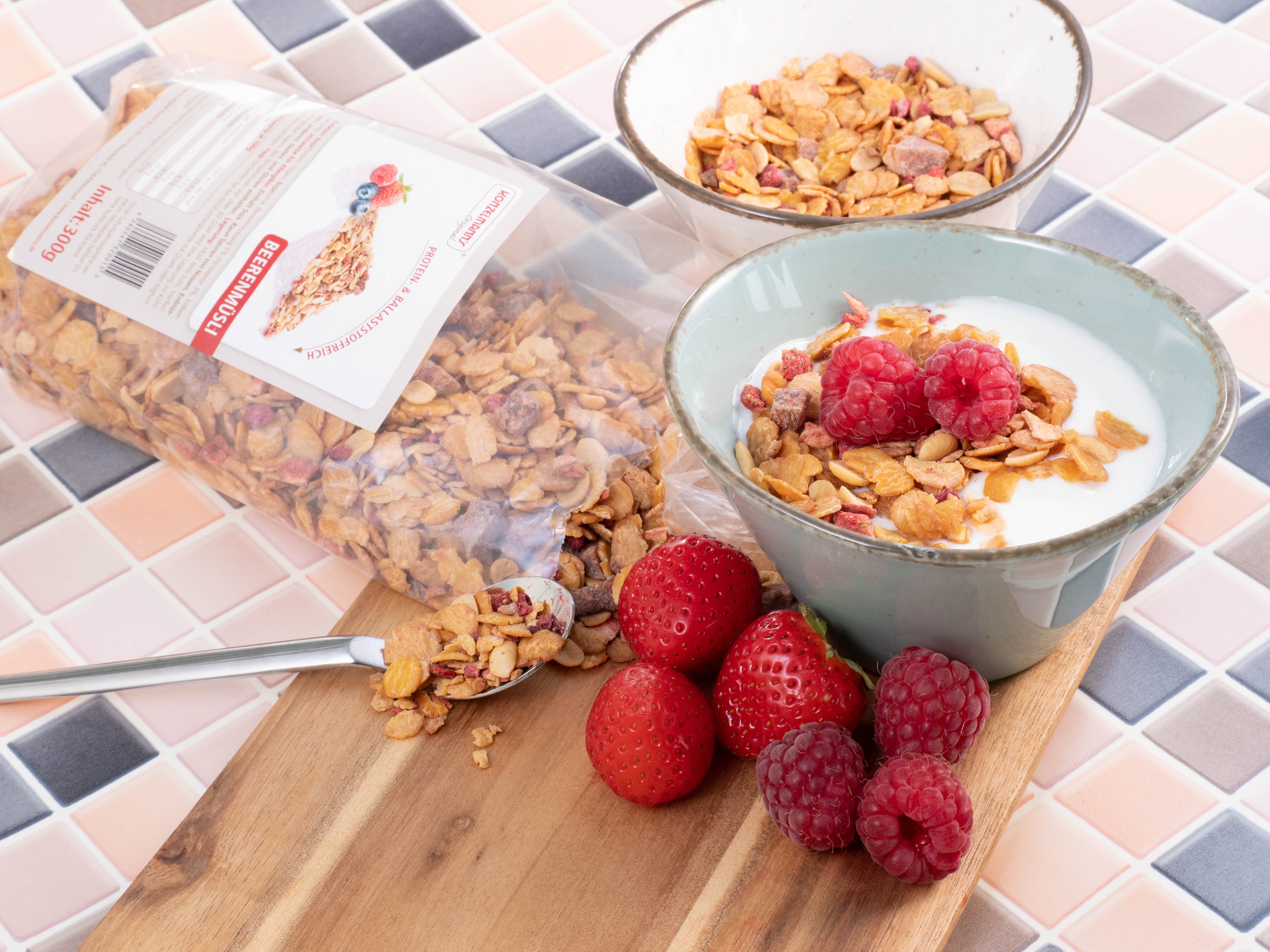 - Ca. 30 % weniger Kohlenhydrate als herkömmliches Beeren Müsli