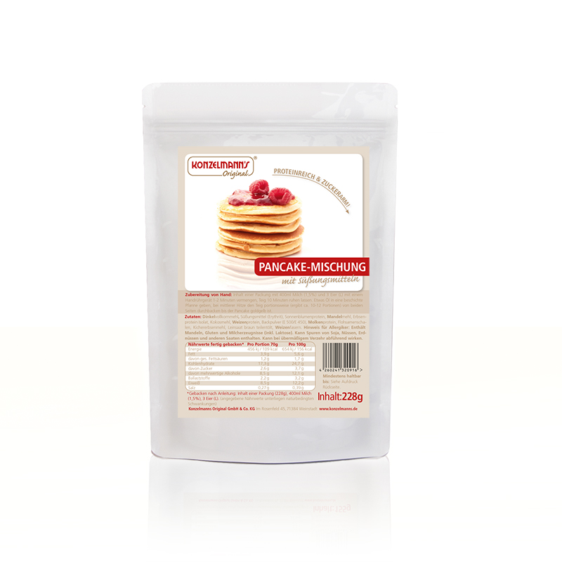 Die Protein-Pancakes von Konzelmann’s Original haben es wirklich in sich: jede Menge Eiweiß bei einem besonders geringen Anteil an Zucker. Dennoch sind unsere Pancakes einfach unwiderstehlich lecker: Die Süße stammt von hochwertigem Erythrit, sodass der tatsächliche Zuckeranteil bei unter 4 % liegt. Eine Packung dieser Backmischung reicht für zehn bis zwölf leckere Pancakes, die man also auch mit seinen Liebsten teilen kann.