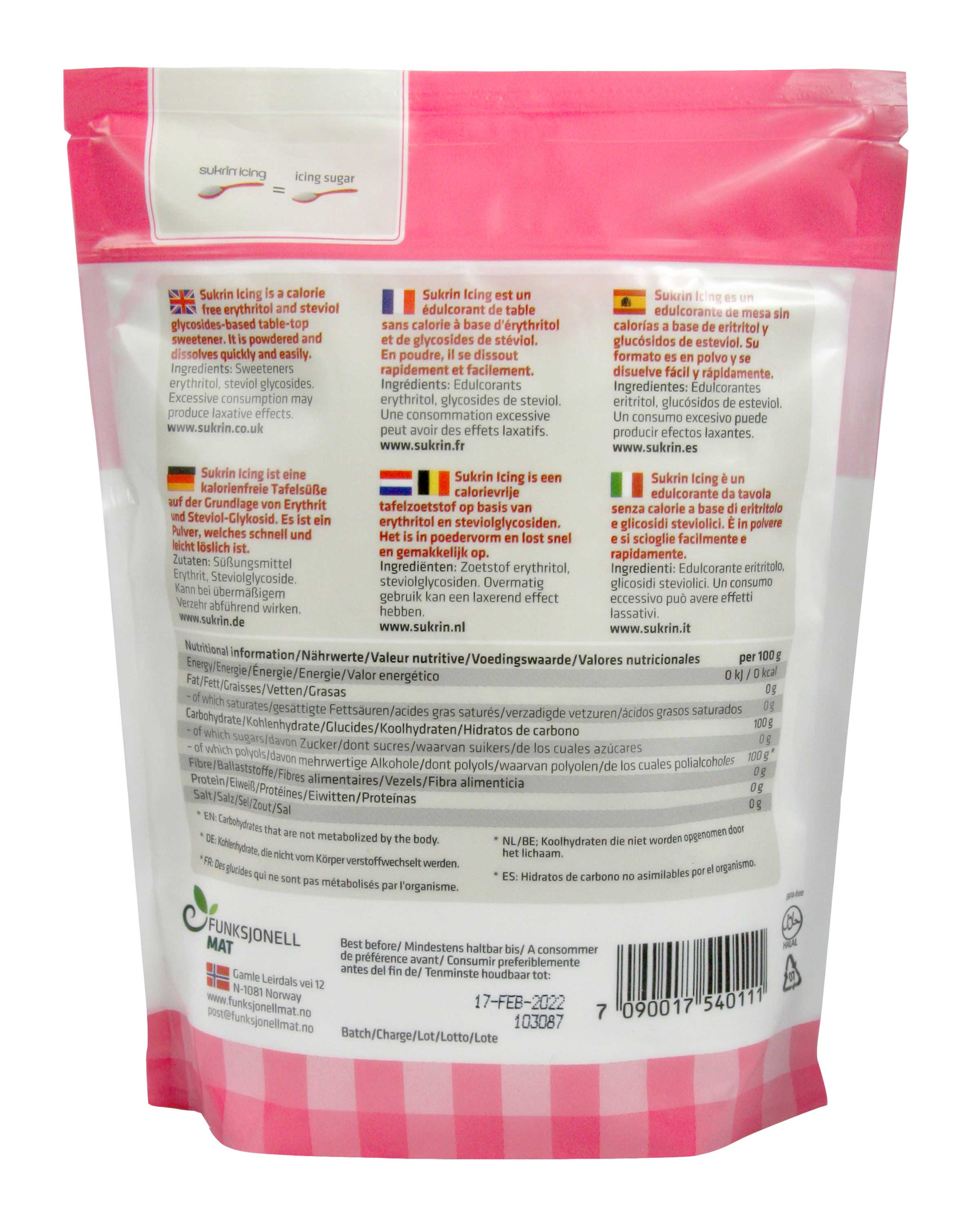 Sukrin Icing (Puderzucker Ersatz / Erythrit mit Steviolglycoside fein vermahlen) hat keine Kalorien, ist zahnfreundlich, schmeckt wie Puderzucker und sieht aus wie Puderzucker. Der Glykämische Index bei Sukrin Icing Ersatz liegt bei Wert 0. MIt Sukrin Icing süßen Sie ohne Kalorien. Zuckerfrei - mit vollem Geschmack und natürlich. Sukrin enthält keine Zusatzstoffe und ist ohne Gentechnik hergestellt.